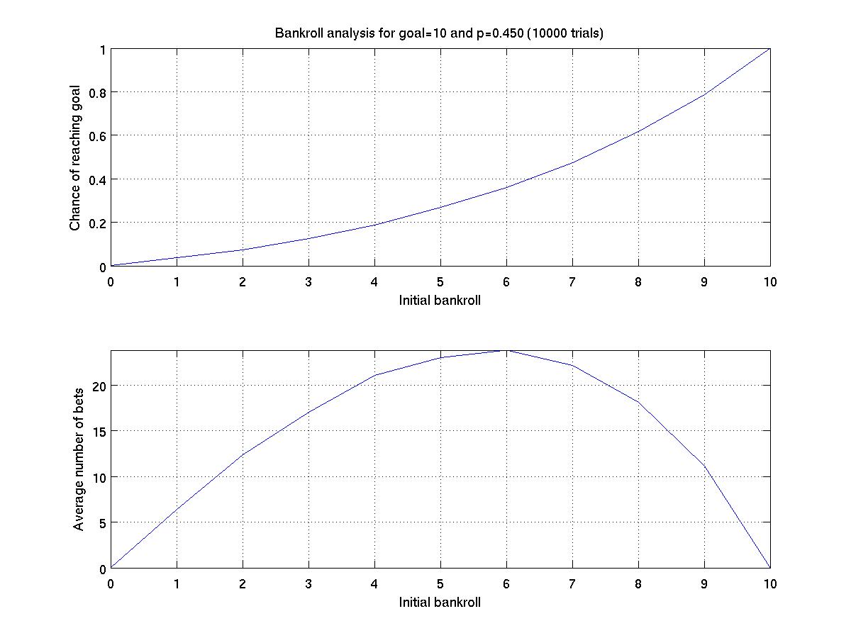 This shows that with an initial bankroll of 5, the chance of success